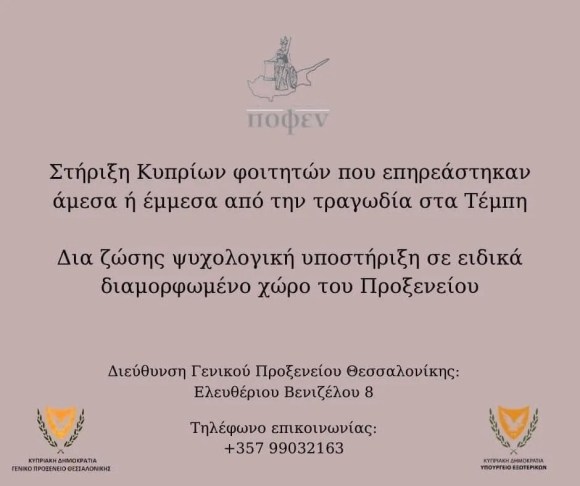 - Ψυχολογική υποστήριξη στους Κύπριους Φοιτητές που άμεσα ή έμμεσα επηρεαστήκαν από την σύγκρουση των τρένων στα Τέμπη σε συνεργασία με το Υπουργείο Εξωτερικών και το Προξενείο της Κύπρου στη ΘεσσαλονίκηΩς Παγκύπρια Ομοσπονδία Φοιτητικών Ενώσεων με γνώμονα την υπό τις περιστάσεις καλύτερη δυνατή υποστήριξη των Κύπριων φοιτητών που άμεσα ή έμμεσα επηρεαστήκαν από την σύγκρουση των… Read more: Ψυχολογική υποστήριξη στους Κύπριους Φοιτητές που άμεσα ή έμμεσα επηρεαστήκαν από την σύγκρουση των τρένων στα Τέμπη σε συνεργασία με το Υπουργείο Εξωτερικών και το Προξενείο της Κύπρου στη Θεσσαλονίκη