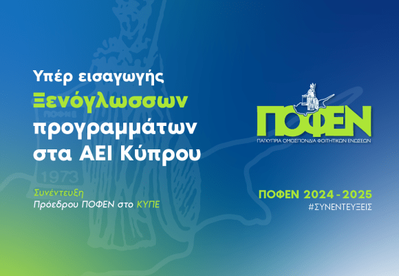 - Υπέρ εισαγωγής Ξενόγλωσσων προγραμμάτων στα ΑΕΙ ΚύπρουΗ Παγκύπρια Οργάνωση Φοιτητικών Ενώσεων (ΠΟΦΕΝ) υποστηρίζει την εισαγωγή ξενόγλωσσων προγραμμάτων σπουδών στα Ανώτερα Εκπαιδευτικά Ιδρύματα (ΑΕΙ) της Κύπρου, θεωρώντας την πρωτοβουλία αυτή κομβική για τη… Read more: Υπέρ εισαγωγής Ξενόγλωσσων προγραμμάτων στα ΑΕΙ Κύπρου