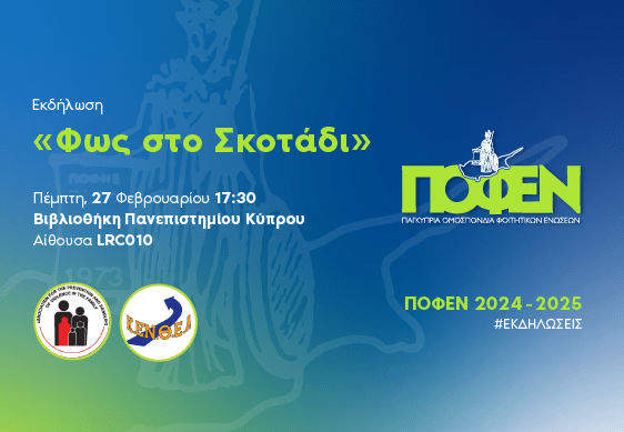 - Εκδήλωση «Φως στο Σκοτάδι»Εκδήλωση «Φως στο Σκοτάδι» 🔦 Χθες, στον χώρο του Πανεπιστημίου Κύπρου, πραγματοποιήθηκε η εκδήλωση «Φως στο Σκοτάδι», που διοργάνωσε η Παγκύπρια Ομοσπονδία Φοιτητικών Ενώσεων (ΠΟΦΕΝ), σε… Read more: Εκδήλωση «Φως στο Σκοτάδι»