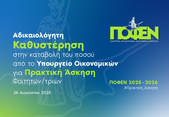 - Αδικαιολόγητη Καθυστέρηση στην Καταβολή του Ποσού από το Υπουργείο Οικονομικών για την Πρακτική Άσκηση Φοιτητών/τριώνΗ Παγκύπρια Ομοσπονδία Φοιτητικών Ενώσεων (ΠΟΦΕΝ) εκφράζει την έντονη αγανάκτησή της για την απαράδεκτη καθυστέρηση στην καταβολή του επιδόματος πρακτικής άσκησης προς τις φοιτήτριες και τους… Read more: Αδικαιολόγητη Καθυστέρηση στην Καταβολή του Ποσού από το Υπουργείο Οικονομικών για την Πρακτική Άσκηση Φοιτητών/τριών
