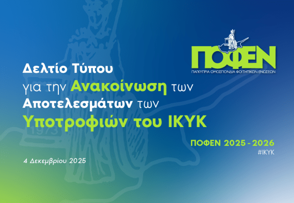 - Δελτίο Τύπου για την Ανακοίνωση των Αποτελεσμάτων των Υποτροφιών του ΙΚΥΚΗ ΠΟΦΕΝ εκφράζει την έντονη ανησυχία και δυσαρέσκειά της για την κατάσταση που έχει δημιουργηθεί με την ανακοίνωση των αποτελεσμάτων των υποτροφιών του ΙΚΥΚ.Για δεύτερη χρονιά,… Read more: Δελτίο Τύπου για την Ανακοίνωση των Αποτελεσμάτων των Υποτροφιών του ΙΚΥΚ
