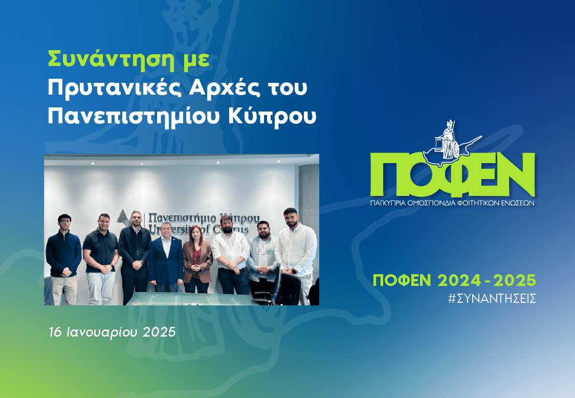 Την Πέμπτη, 16 Ιανουαρίου 2025, πραγματοποιήθηκε συνάντηση μεταξύ της Γενικής Γραμματείας της Παγκύπριας Ομοσπονδίας Φοιτητικών Ενώσεων (ΠΟΦΕΝ) και των Πρυτανικών Αρχών του Πανεπιστημίου Κύπρου, Πρύτανη Καθηγητή κ. Τάσος Χριστοφίδης και Αντιπρύτανη Ακαδημαϊκών Υποθέσεων Καθηγήτρια κα. Ελένη – Τατιανή Συνοδινού. Στη συνάντηση συζητήθηκαν καίρια ζητήματα που αφορούν τη φοιτητική κοινότητα, με κύριους άξονες τη φοιτητική μέριμνα, το στεγαστικό, την πρακτική άσκηση, τα ξενόγλωσσα προγράμματα σπουδών και την ίδρυση Πανεπιστημιακού Νοσοκομείου.