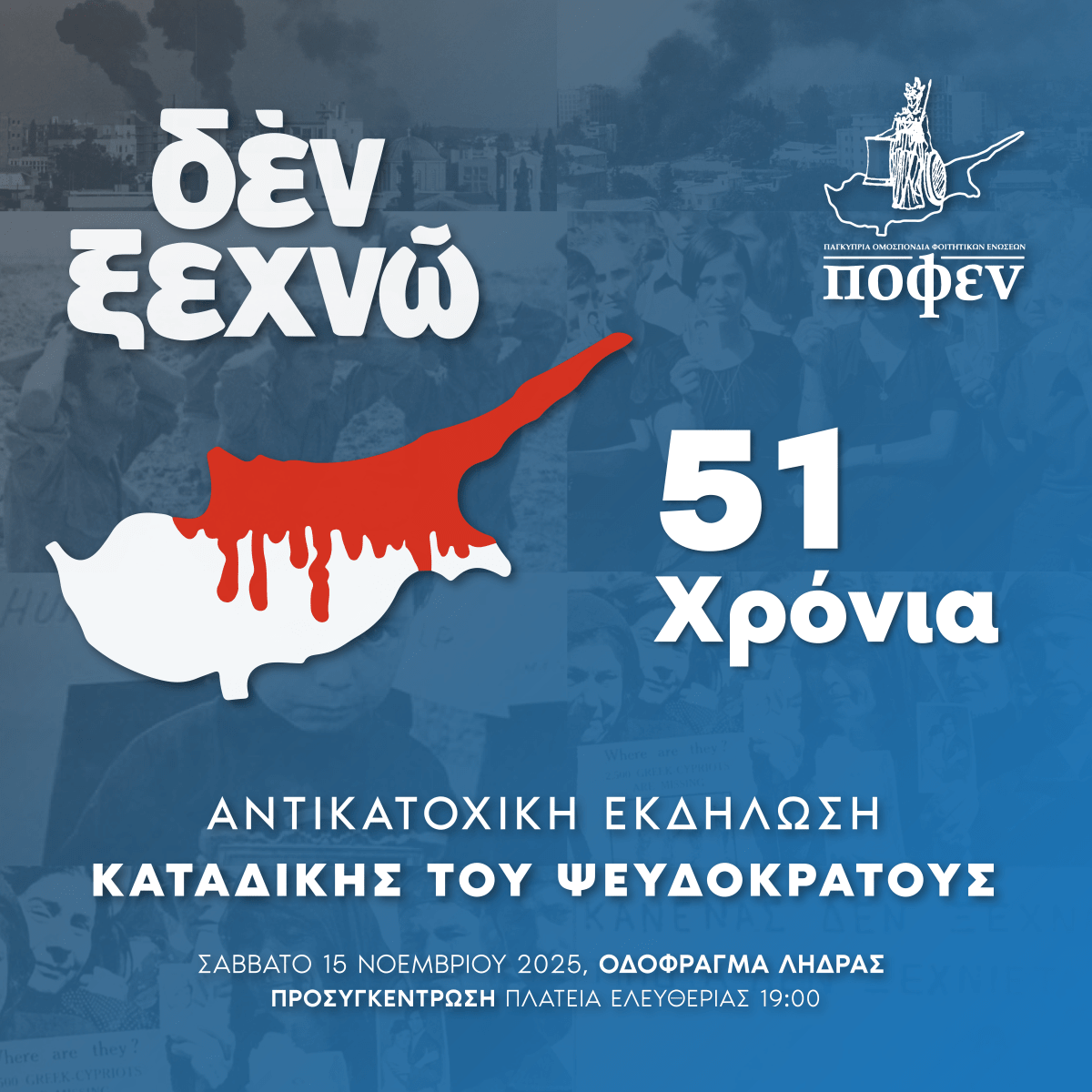 Η Παγκύπρια Ομοσπονδία Φοιτητικών Ενώσεων (ΠΟΦΕΝ) καλεί κάθε νέο και νέα, κάθε πολίτη που πονά και αγωνιά για την πατρίδα μας, να σταθεί μαζί μας στην αντικατοχική εκδήλωση καταδίκης του ψευδοκράτους.
